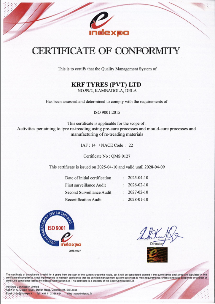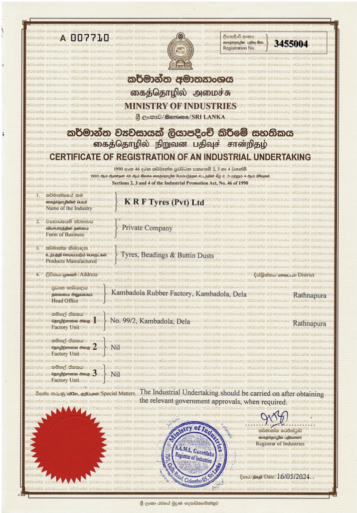 Officially issued by the Sri Lankan government’s industry registry, this certificate recognizes KRF Tyres as a duly registered manufacturing enterprise. It highlights our adherence to national regulations and our forward-looking focus on responsible, sustainable industrial growth.